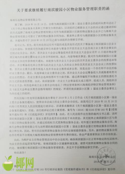 新聘任的海南天会物业管理公司负责人说:“我们是依法取得合法的物业管理权,今天是新老物业交接日,没有想到老物业拒绝交接,还引来派出所、住建部门和街道办等同志协调。”