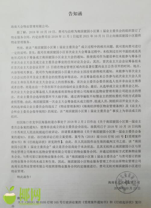 随后记者从长泓物业管理有限公司对天会物业管理有限公司及该小区业主的告知函中了解到,长泓物业管理有限公司之所以不肯交出该小区管理权,据称是因为该公司在小区第一届业主委员会筹备期间没有接到过任何关于此事的通知,未能参与该委员会相关投票活动,且委员会筹备人员抱着将该公司赶出去的想法,故在投票活动中骗取不知情业主的票数。故此,长泓物业管理有限公司认为该小区第一届业主委员无权终止该小区与长泓物业管理有限公司签订的物业管理合同。