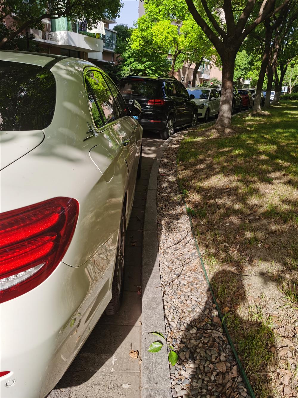 小区停车位旁的草坪边铺上一部分石子,为了方便业主雨天下车